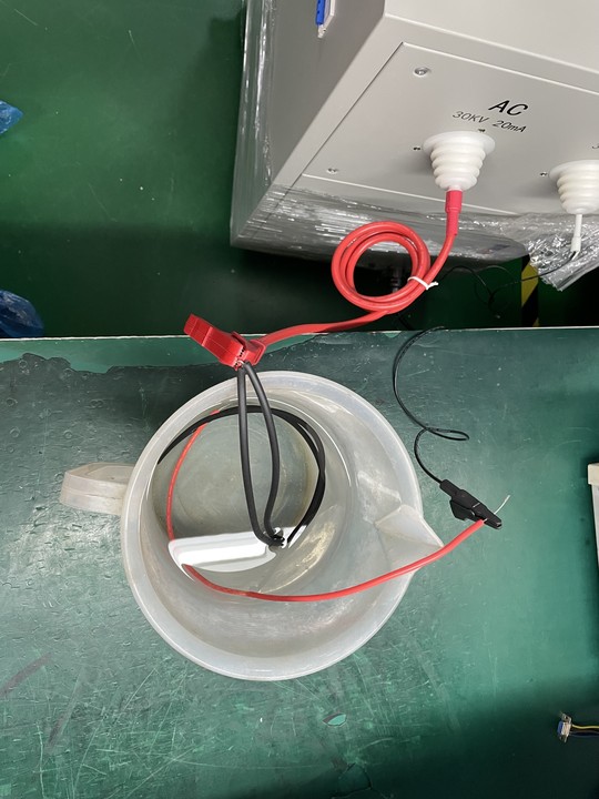 首先是對(duì)被測(cè)物處理:拿住線材兩端剝?nèi)?厘米左右長(zhǎng)度絕緣層,將兩個(gè)線芯擰在一起并接到高壓輸出端上。拿個(gè)塑料盆子裝盆清水,把線材放入水中(線芯不要沾到水),把儀器回路端放到清水中。接線完成打開(kāi)儀器開(kāi)關(guān),慢慢調(diào)節(jié)電壓,觀察電流上升情況。如線材絕緣性能不好,電流會(huì)不斷上升,最終觸發(fā)報(bào)警產(chǎn)品不合格。