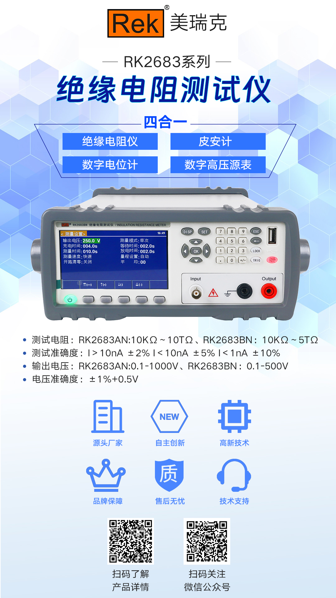 RK2683系列:該系列絕緣電阻測(cè)試儀測(cè)試電壓(1V-1000V)符臺(tái)GB4706.1.其這得電阻測(cè)式范圍最大可達(dá)到(10K-10T).RK2683系列可滿足大部分家用電器的絕絡(luò)電緣測(cè)試要求
